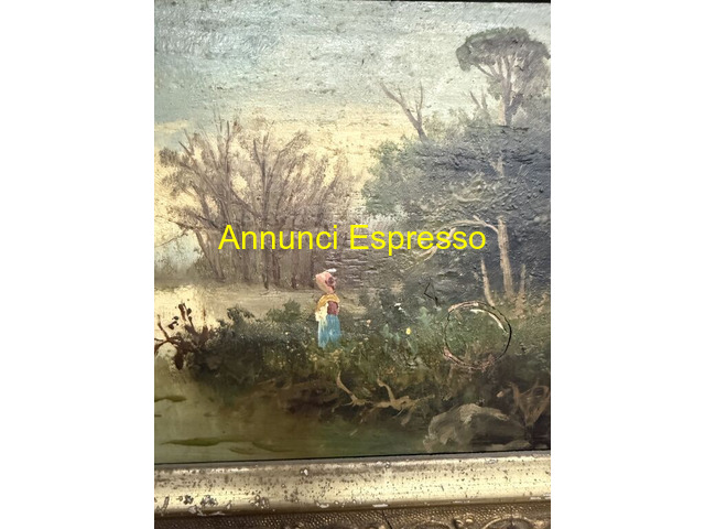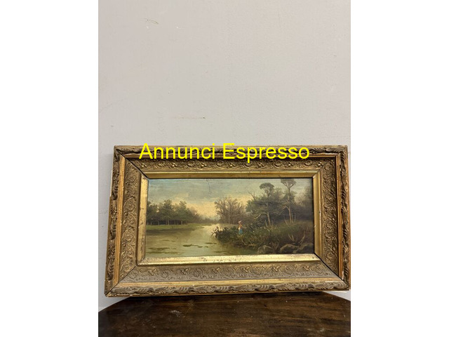 Antico paesaggio olio su tavola 1850, Francia prezzo EUR.320,00 Antico paesaggio dipinto, olio su tavola 1850, Francia con cornice dorata in pastiglia, 50x32cm, solo dipinto 37x18cm. Stato buono, piccole usure dovute al tempo. Cornice antica coeva. Viterbo (VT)