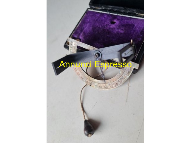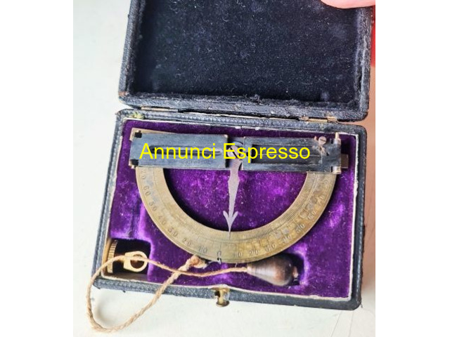 Antico strumento goniometro semicircolare in otton prezzo EUR.128,00 Antico strumento goniometro semicircolare in ottone . Si tratta di uno strumento dotato di traguardi, e filo a piombo. Supporto non originale . Custodia originale con struttura in legno rivestita di velluto, dimensioni cm. 8 x cm5, 5 x cm. 2 . Vendo € 128 . Gradito contatto telefonico wapp . Cell Lodi (LO)