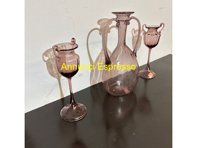 Antico Tritico in vetro rosa Amatista 1920 Zecch prezzo EUR.380,00 Antico Tritico in vetro rosa Amatista 1920 manifattura Zecchin ? Cappellin Murano Venezia. H23 h 19 composto da ampolla più due vasi laterali . Di grande raffinatezza . L ampolla ha un difetto/ filatura sotto un manico come evidenziato dalla foto . Viterbo (VT)