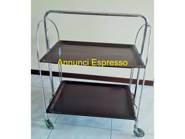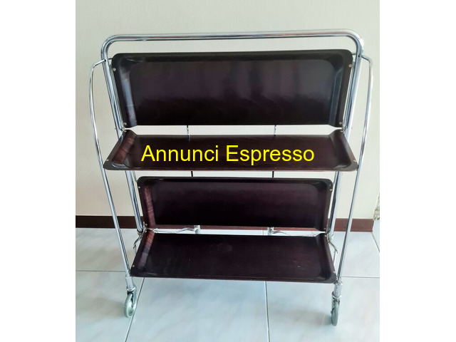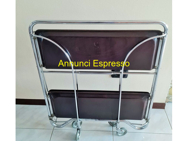 Carrello GERLINOL pieghevole, prodotto tedesco deg prezzo EUR.150,00 Carrello GERLINOL pieghevole, prodotto tedesco degli anni ?60. La struttura è cromata e i due ripiani sono in formica con le venature tipo legno palissandro . Il carrello è in buone condizioni, presenta lievi segni del tempo e qualche piccola traccia di ruggine . Dimensioni: altezza cm . 78 cm larghezza cm . 65 profondità 42 cm (chiuso cm 26 ). Vendo ? 150 . Non spedisco . Gradito contatto telefonico cel. [NUM] Lodi (LO)