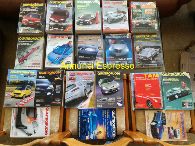 COLLEZIONE QUATTRORUOTE prezzo EUR.77,00 COLLEZIONE RIVISTE QUATTRORUOTE CON I VARI ALLEGATI DAL 1988 AL 2007 PER UN TOTALE DI 73 PEZZI SONO DISPONIBILE PER INF. FOTO POSSIBILE SPEDIZIONE DISPONIBILI I SEGUENTI NUMERI ANNO 1988 GENNAIO, FEBBRAIO ANNO 1990 GENNAIO, MARZO, MAGGIO, AGOSTO ANNO 1991 MAGGIO, SETTEMBRE, OTTOBRE, NOVEMBRE ANNO 1993 GENNAIO ANNO 1994 GIUGNO, LUGLIO, AGOSTO, SETTEMBRE, NOVEMBRE, DICEMBRE ANNO 1995 APRILE, GIUGNO, LUGLIO, AGOSTO, SETTEMBRE, OTTOBRE ANNO 1996 GENNAIO, FEBBRAIO, MARZO, APRILE, LUGLIO, AGOSTO, OTTOBRE, NOVEMBRE, DICEMBRE ANNO 1997 GENNAIO, FEBBRAIO, MAGGIO, LUGLIO, AGOSTO, SETTEMBRE, OTTOBRE, NOVEMBRE, DICEMBRE ANNO 1998 GENNAIO, FEBBRAIO, AGOSTO, SETTEMBRE ANNO 1999 GENNAIO, DICEMBRE ANNO 2000 AGOSTO, OTTOBRE ANNO 2001 GENNAIO, APRILE, OTTOBRE, DICEMBRE ANNO 2002 FEBBRAIO, AGOSTO, SETTEMBRE, OTTOBRE ANNO 2003 AGOSTO, SETTEMBRE, OTTOBRE, NOVEMBRE, DICEMBRE ANNO 2004 GENNAIO, OTTOBRE + TUTTE LE AUTO DEL MONDO ANNO 2005 APRILE, AGOSTO, SETTEMBRE, OTTOBRE, DICEMBRE ANNO 2006 MARZO ANNO 2007 GENNAIO, GIUGNO Matera (MT)