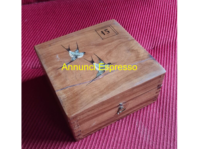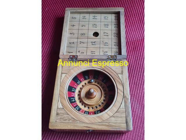 Gioco d'antan scatola di legno con una ROULETTE prezzo EUR.138,00 Gioco d'antan scatola di legno con una ROULETTE a 24 numeri , pallina in ferro e tabella numeri sempre in legno estraibile a lato per le puntate, sotto la medesima , si trova il gioco antico del 15. Dimensioni cm 11 X. cm 11. Vendo EUR.138. Gradito contatto telefonico Lodi (LO)