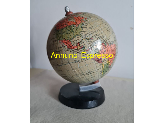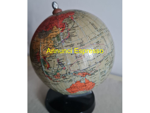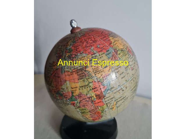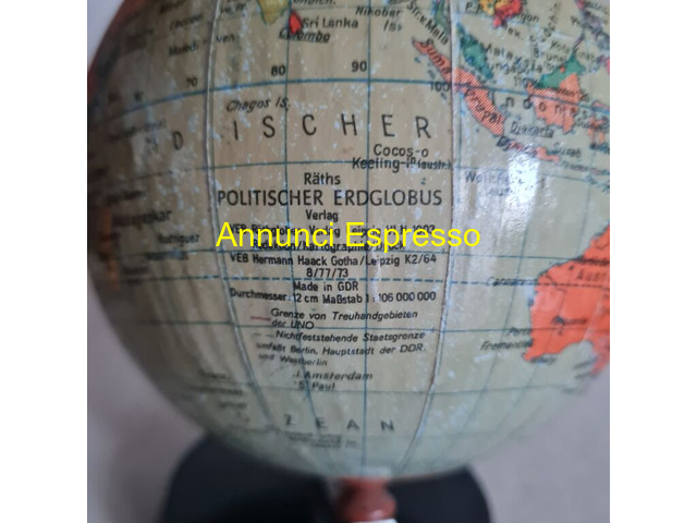 Globo Terrestre Tedesco Räths DDR 1964 prezzo EUR.88,00 Globo Terrestre Tedesco Räths DDR 1964 piccolo mappamondo da collezione con la mappa stampata su dodici spicchi, il globo ruota su un asse centrale con supporto in metallo ed è sorretto da un piedistallo in bachelite diametro cm . 9. Si presenta in buono stato di conservazione, con patina originale. Al di sotto dell?Equatore e a ovest dell?Australia, l?iscrizione Räths Politischer Erdglobus Verlag . Durchmesser 12 cm / Maßstab 1:[NUM] / Druck: VEB Hermann Haack Gotha/ Leipzig. . K2/64. . 8/77/73 . Vendo ? 88. Gradito contatto telefonico wapp. [NUM]. Lodi (LO)
