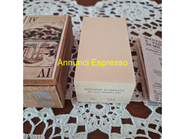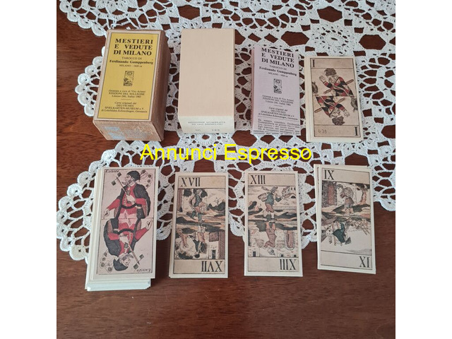 Mestieri e Vedute di Milano Gumppenberg Del Solleo prezzo EUR.68,00 Mestieri e Vedute di Milano Gumppenberg Del Solleone Edizione Numerata, n 188/1000. Ristampa a cura di Vito Arienti edizione 1982. Carte divinatorie di Ferdinando Gumppenberg Milano 1820. Mazzo composto da 78 carte + istruzioni in lingua italiana. Stato dell?oggetto: carte mai usate quindi come da foto . Dimensioni: cm 9, 7 x 5. Vendo ? 68. Gradito contatto telefonico wapp. [NUM] Lodi (LO)