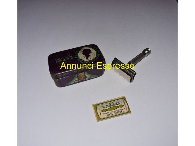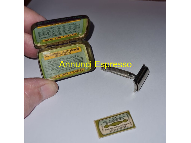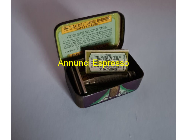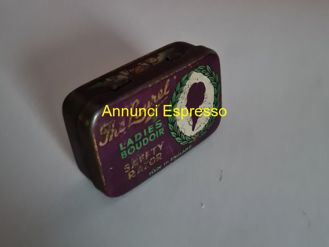 Mini rasoio di sicurezza The Laurel Ladies Boudoi prezzo EUR.58,00 Mini rasoio di sicurezza The Laurel Ladies Boudoir. Anni ?30 made in England , lame contrassegnate dal marchio made in Sheffield . La confezione misura cm . 4 x cm . 2, 5 x cm . 1, 5 . Dimensioni lame cm. 2, 5 x cm 1, 4 e viene fornito di due lame una riposta nel rasoio e di una lama di ricambio nella confezione originale. La custodia in latta presenta qualche segno di usura , ma il rasoio è in ottime condizioni come da foto. . Vendo ? 58 . Gradito contatto telefonico [NUM] Lodi (LO)