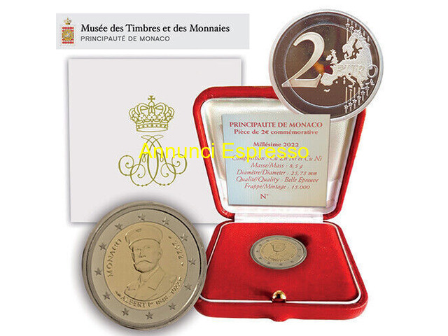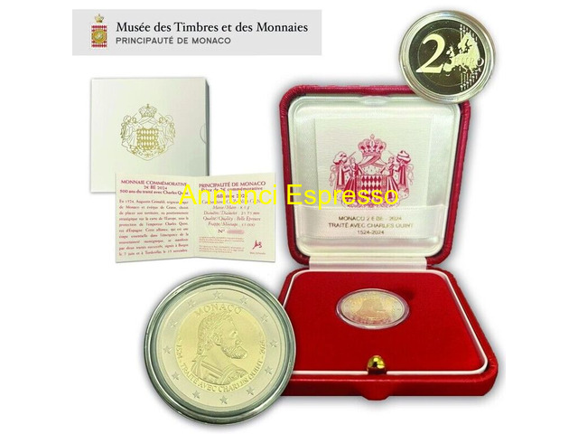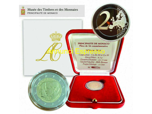 Monaco 2? commemorativo 2021, 2022, 2024. 2025 prezzo EUR.1,00 Vendesi monete commemorative da 2? ?Belle Epreuve? emesse da Monaco nel: - 2021 per celebrare il ?10º anniversario di matrimonio del principe Alberto II di Monaco con Charlène Wittstock? - 2022 per celebrare il ?100º anniversario della morte del principe Alberto I Grimaldi di Monaco? - 2024 per celebrare il ?500º anniversario del Trattato con Carlo V? - 2025 per celebrare il ?Marchesato di Baux? Complete di cofanetto, certificato di autenticità e scatolina, così come ricevute dal Principato. Ritiro e pagamento di persona a Milano o immediate vicinanze, oppure spedizione, previo accordi. Prezzo a richiesta. Milano (MI)