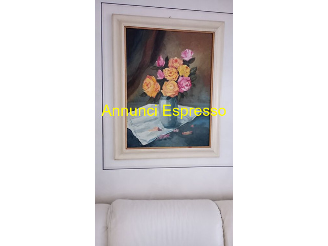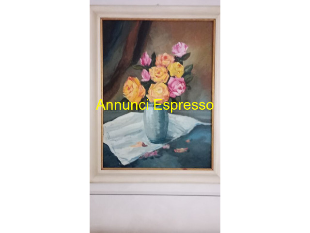 Quadri d'autore prezzo EUR.1.200,00 Quadro ad olio raffigurante un mazzo di rose colorate in vaso su tovaglia. Cornice bianca, ideale per decorazione domestica. La coppia Agnosine (BS)