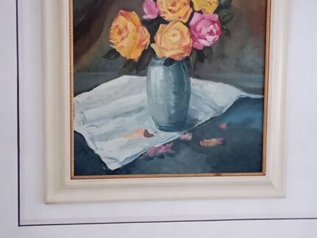 Quadri d'autore prezzo EUR.1.200,00 Quadro ad olio raffigurante un mazzo di rose colorate in vaso su tovaglia. Cornice bianca, ideale per decorazione domestica. La coppia Agnosine (BS)