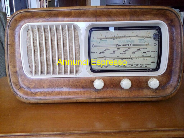 RADIO VINTAGE ANNI 50 prezzo EUR.80,00 KOSMOVOX MODELLO 185 FUNZIONANTE A VALVOLE 2 ONDE MEDIE 2 ONDE CORTE RIVESTITA IN RADICA OTTIMA PER ARREDO MISURE L. 52, 5 X P. 22 X H. 28 KG. 7, 5 SONO DISPONIBILE PER INF. FOTO POSSIBILE SPEDIZIONE Matera (MT)