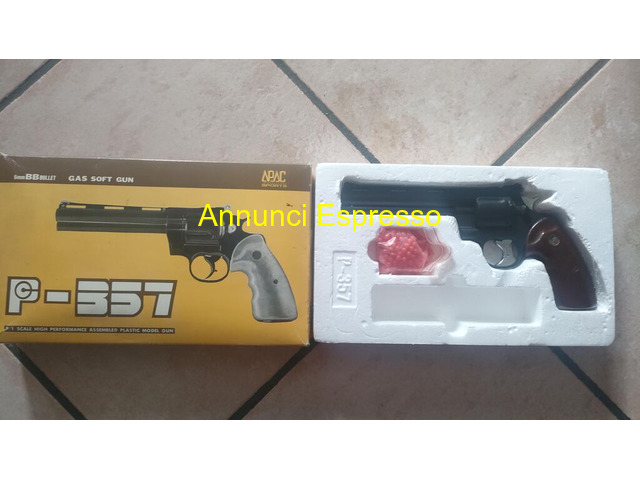 REVOLVER GNB P-357 GREEN GAS prezzo EUR.60,00 -MARCA APAC -REVOLVER Colt Python P-357 -COLORE NERO -CAL 6mm SOFT AIR -COLPO SINGOLO -IN ABS CON PARTI IN METALLLO -HOP UP FISSO -CARICATORE SOTTOCANNA DA 15pz -FUNZIONAMENTO CON GREEN GAS -PESO 500gr -LUNGHEZZA 30cm -LUNGHEZA CANNA 6" Roma (RM)