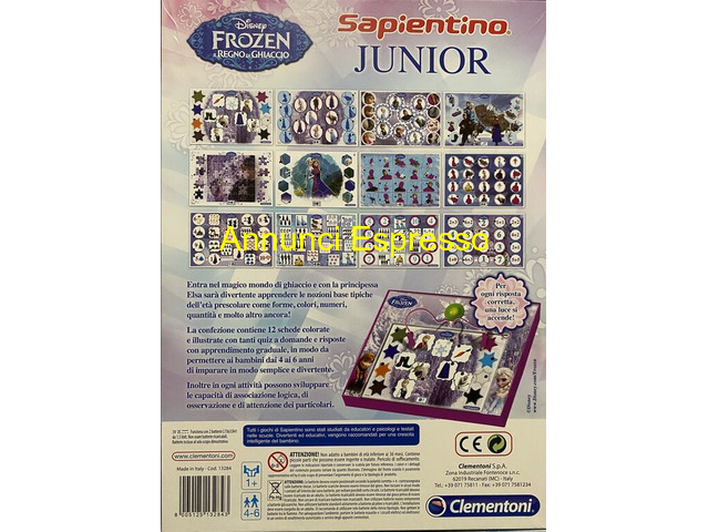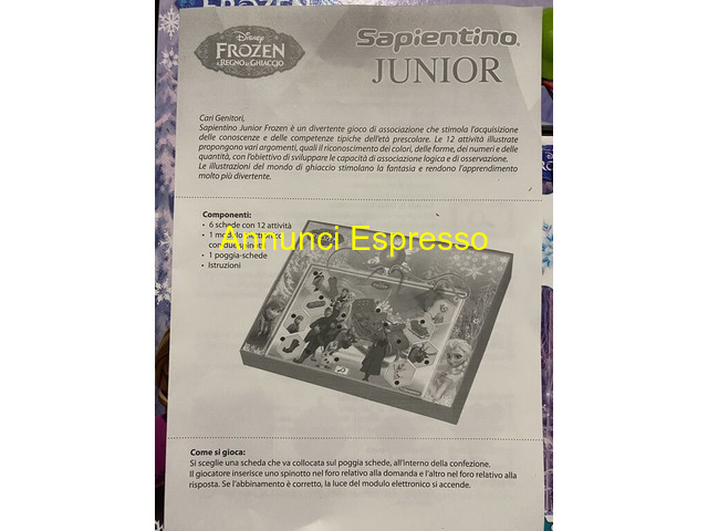 Sapientino Junior Clementoni gioco per bimbi Fascia di età 3-6 anni prezzo EUR.10,00 Gioco educativo Sapientino Junior Frozen Clementoni Il Regno del Ghiaccio Adatto per bambini di età 4-6 anni. Contiene schede colorate con tanti quiz a domande e risposte con apprendimento graduale. Vendo a € 10 + spese di spedizione Rivello (PZ)