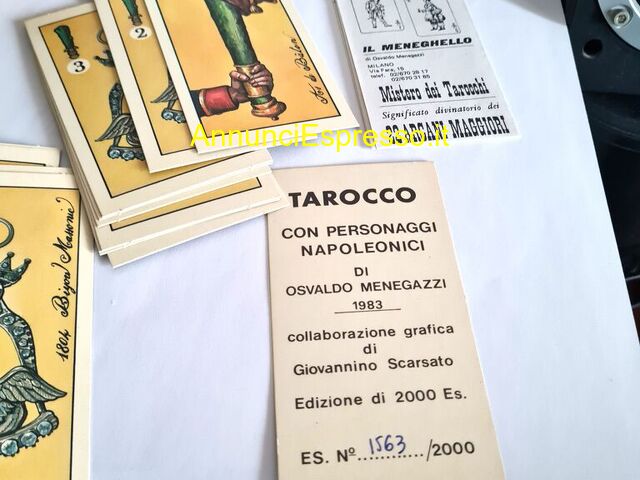Tarots Con Personaggi Napoleonici IL Meneghello 19 prezzo EUR.78,00 Tarots Con Personaggi Napoleonici IL Meneghello 1983 edizione numerata N° 1563 / 2000 edizione grafica di Giovannino Scarsato. Nuovo mai usato con istruzioni. Dimensioni carte cm, 10. 3 x cm . 6 Vendo ? 78 . Gradito contattato telefonico . [NUM] Lodi (LO)