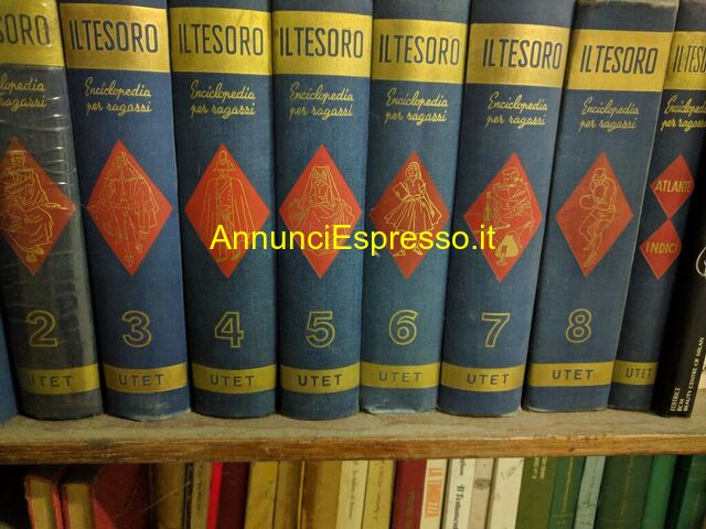 Vendo Enciclopedie complete prezzo EUR.50,00 Vendo Enciclopedie complete: ENCICLOPEDIA PER RAGAZZI IL TESORO 8 volumi; ENCICLOPEDIA MONDADORI DELLA SCIENZA, CUCINA PRATICA e NATURA E SALUTE; In buone condizioni. Totale tutto 50, 00. Serie di libri intitolati "Il Tesoro", edizione completa, nove volumi, copertina rigida blu con decorazioni rosse, in buone condizioni. Zola Predosa (BO)