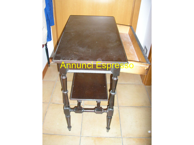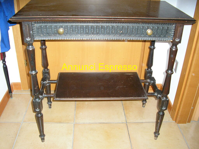 Vendo Tavolino Antico prezzo EUR.85,00 Vendo Tavolino Antico, con cassetto, messo bene in ottime condizioni; misure: altezza 74 cm lunghezza 77, 5 cm larghezza 41 cm al prezzo trattabile 85, 00. Tavolino in legno scuro con ripiano inferiore, dettagli intagliati e cassetto. Zola Predosa (BO)