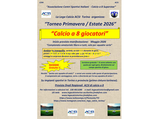 Calcio a otto giocatori Torneo Primavera 2026.Articoli Sportivi - Biciclette - Torino (Torino) - 22/12/2025 € 80Calcio a otto giocatori Torneo Primavera 2026. ACSI prezzo EUR.80,00 La nostra Associazione Sportiva è attiva da molti anni nell'organizzazione di campionati e tornei a Torino, offrendo un ambiente competitivo e amichevole per tutti i nostri mem...