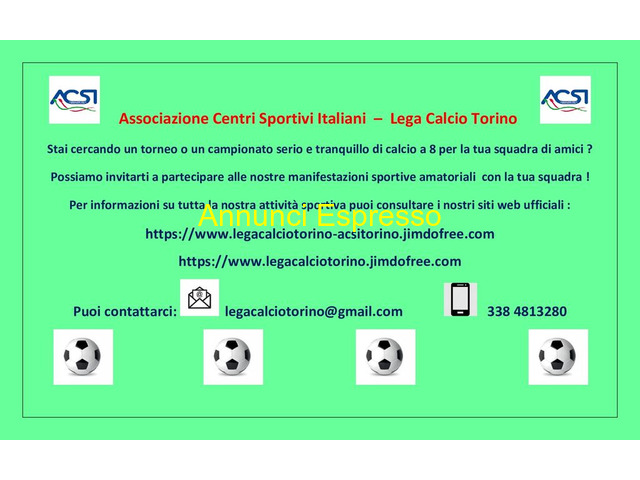 Campionati e tornei amatoriali di calcio a otto ACSI prezzo EUR.78,00 La nostra Associazione Sportiva NO PROFIT ACSI Torino è attiva da molti anni nell'organizzazione di campionati e tornei a Torino, offrendo un ambiente competitivo e amichevole per tutti i nostri membri. Partecipate ai nostri eventi per vivere l'emozione del calcio a 8 in un'atmosfera di divertimento e fair play. Organizziamo Campionati e Tornei amatoriali di calcio a 8 durante tutta la stagione sportiva con iscrizione gratuita e versamento di una semplice quota ogni gara. Il campionato più serio, economico e divertente per la tua squadra ! Massima serietà , NO LUCRO. Per informazioni tel. [NUM] - ACSI Lega Calcio Torino. Torino (TO)