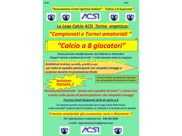 Campionati e tornei di calcio a otto giocatori ACSI prezzo EUR.80,00 La nostra Associazione Sportiva NO PROFIT ACSI Torino è pronta a dare il via a una nuova stagione di emozioni e divertimento! Organizziamo campionati e tornei amatoriali di calcio a otto giocatori, dove ogni partita diventa un'opportunità per divertirsi e fare nuove amicizie. Con iscrizione gratuita e una semplice quota per ogni gara, il nostro campionato è il più serio, economico e divertente per la tua squadra! Non perdere l'occasione di partecipare e di vincere premi sorprendenti durante le cerimonie di premiazione. Porta una squadra di amici e ricevi uno sconto sulla quota di partecipazione! Contattaci al [NUM] per maggiori informazioni. Ti aspettiamo per vivere insieme il calcio in un'atmosfera di fair play! ?. Torino (TO)