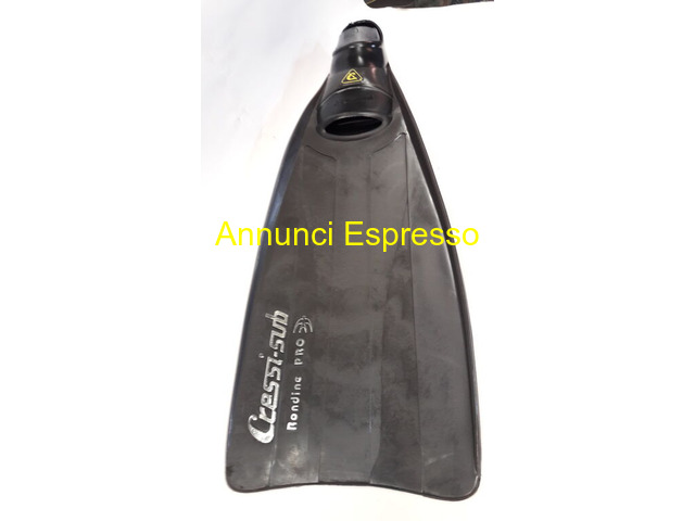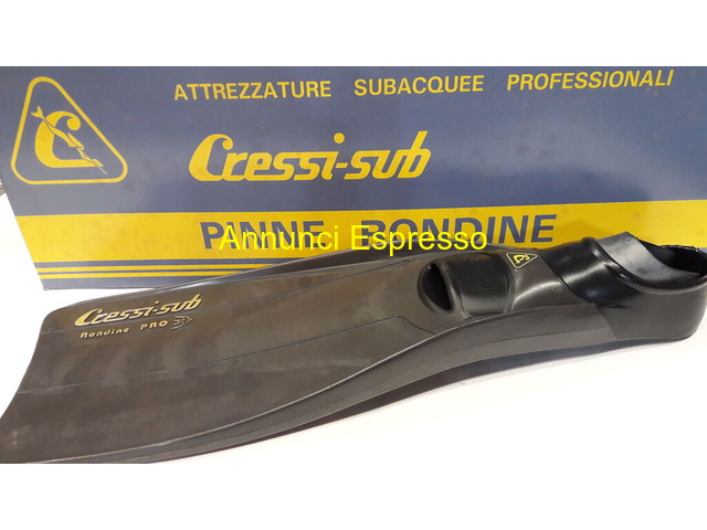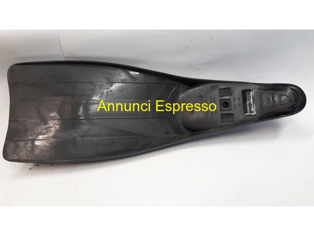 Pinne subacquee CRESSI RONDINE PRO DARK mis. 40/41 CRESSI SUB prezzo EUR.35,00 Cressi Rondine Pro Dark è una pinna versatile di medie dimensioni di colore nero a scarpetta chiusa , caratterizzata da un profilo arcuato e da nuovi materiali che le conferiscono maneggevolezza, reattività e resa propulsiva a fronte di un impegno fisico ridotto. Adatta per immersioni con autorespiratore, apnea leggera e snorkeling : ? La scarpetta, in gomma a spessore differenziato, avvolge anatomicamente il piede, garantendo una perfetta trasmissione delle forze gamba/pinna. ? Due costolature laterali di generoso spessore originano anteriormente dalla scarpetta e si prolungano assottigliandosi per la lunghezza della pala. ? La pala reattiva e flessibile realizzata in tecnopolimero nasce leggermente angolata dalla parte inferiore della scarpetta presentando su entrambi i lati della pala delle ampie scanalature longitudinali che concorrono a regolare la flessione della pala. Le pinne sono nuove, mai utilizzate, in perfette condizioni ed in confezione originale. Lungh. tot pinna cm 60 Roma (RM)