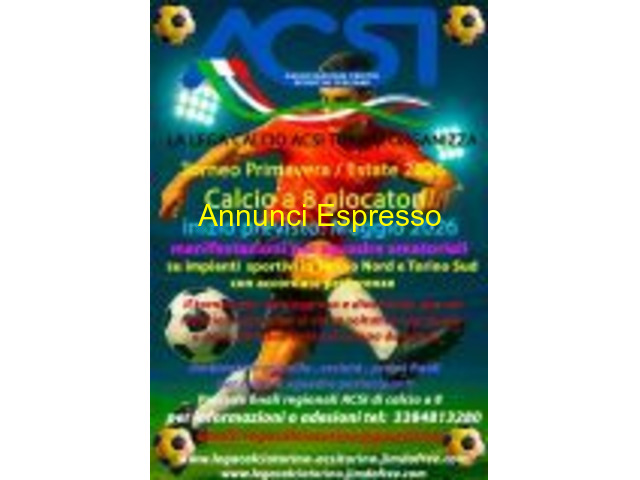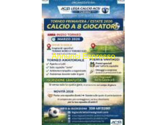 Torneo di calcio a otto giocatori da MarzoArticoli Sportivi - Biciclette - Torino (Torino) - 10/01/2026 € 80Torneo di calcio a otto giocatori da Marzo ACSI prezzo EUR.80,00 Torneo amatoriale di calcio a otto giocatori organizziamo a Torino per la prossia Primavera 2026. Manifestazione amatoriale per squadre serie che intendono partecipare per divertirsi in...