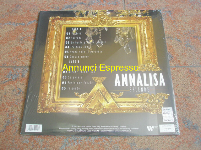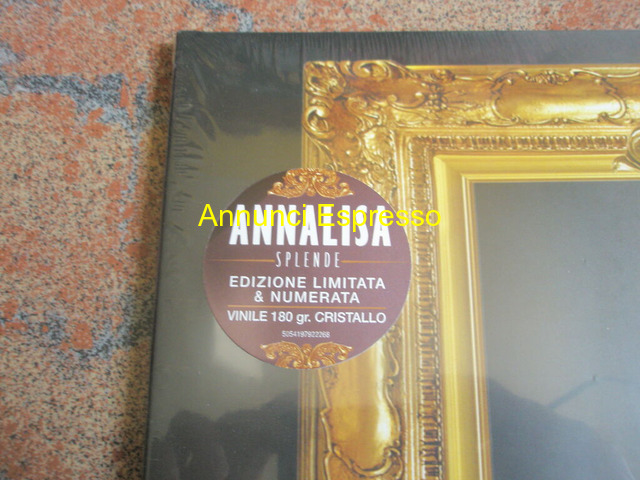 ANNALISA - SPLENDE (2024) LP trasparente, numerato prezzo EUR.69,00 Condizioni : NUOVO - PARZIALMENTE SIGILLATO. Vinile suonato 1 sola volta come verifica di eventuali difetti di stampa durante l'ascolto. Non presenta nessun difetto sia visivo che all'ascolto - Ancora su LA PELLICOLA PROTETTIVA originale a protezione della copertina su entrambi i lati, perche' l'ho aperto solo da 1 lato per poter tirare fuori il disco. Vendo dalla mia collezione privata di LP vinili Vinile - Colore vinile : TRASPARENTE (CRYSTAL) - Particolarita' : Limited edition (NUMERATO) - Anno di stampa : 2024 Legnano (MI)