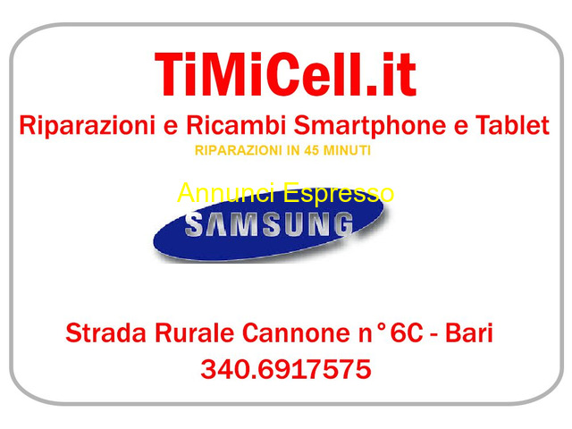 Assistenza Samsung Samsung prezzo EUR.20,00 Servizio di riparazioni e ricambi per smartphone e tablet Samsung. Riparazioni in 45 minuti. Contatti e indirizzo a Bari. TiMiCell Centro Riparazioni Assistenza Samsung, Tablet e tanto altro ( TUTTI I MODELLI ). RIPARAZIONE SOSTITUZIONE DISPLAY, LCD, VETRO, CONNETTORE DI CARICA, JACK CUFFIE, TASTO ACCENSIONE, TASTO HOME, SENSORE DI PROSSIMITà, AURICOLARE, MICROFONO, BACK COVER, FOTOCAMERA POSTERIORE, FOTOCAMERA ANTERIORE, ANTENNA, GPS, WIFI, VIBRAZIONE, TASTI VOLUME, PORTA SIM, CAMBIO COLORE, AGGIORNAMENTO SOFTWARE, SALDATURE SU SCHEDA MADRE ECC. Tutte le nostre riparazioni vengono effettuate al momento in 45 minuti dall'arrivo in negozio . Tutti i nostri ricambi sono testati al momento . Qualità e prezzo assicurati. Per preventivi o per qualsiasi problema non esitate a contattarci . Bari (BA)