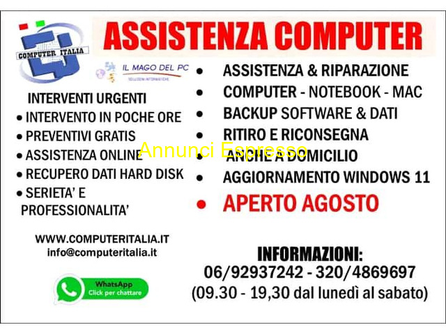 ASSISTENZA COMPUTER ROMA APERTO SABATO COMPUTER ITALIA prezzo EUR.50,00 ASSISTENZA COMPUTER PC ROMA MORENA CIAMPINO TUSCOLANA ANAGNINA CINECITTA' APERTO SABATO ASSISTENZA COMPUTER ROMA DA EURO 50 ASSISTENZA COMPUTER A ROMA APERTO SABATO (9. 30-19. 00) ANCHE A DOMICILIO - A PARTIRE DA ? 50 +IVA CONTATTACI: https://www. computeritalia. it I NOSTRI SERVIZI DA ESPERIENZA VENTENNALE: - Aggiornamento Windows 11 pro da Windows 10 - Su dispositivi obsoleti o non idonei, anche senza formattazione - a partire da ? 50, 00 +iva - Assistenza computer anche a domicilio a Roma Morena Ciampino Anagnina Tuscolana Tor Vergata Capannelle o altre zona (su appuntamento) - Riparazione hardware e assistenza software - Eliminazione virus definitiva - Installazione reti e Configurazione internet - Potenziamento del pc (upgrade) - Consulenza informatica e vendita con preventivi scritti - Installazione periferiche e programmi - Ripristino del computer - Pacchetti assistenza prepagati per Roma (RM)
