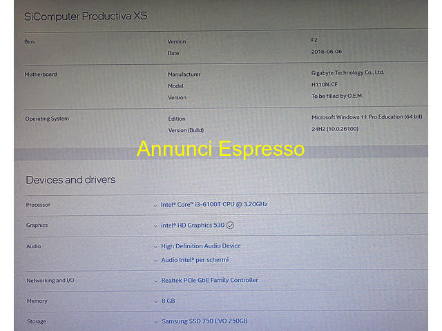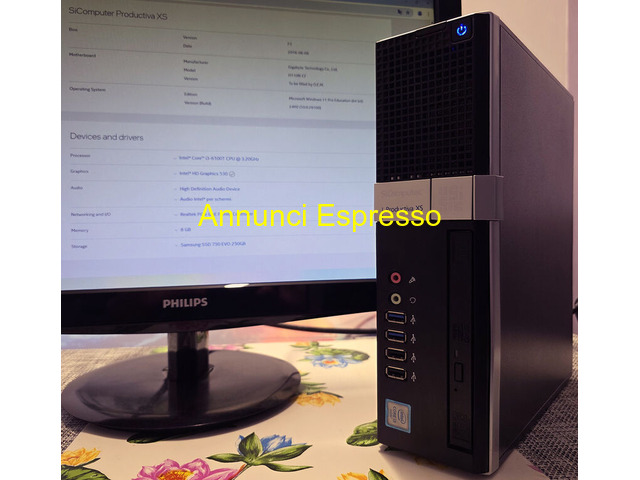 miniPc i3,8Gb ram,SSD 250Gb,HD 530,CD/DVD,Win11pro SiComputer prezzo EUR.150,00 mini PC marca SiComputer modello SIC6011229 Productiva XS, con: processore i3 modello 6100T, 8Gb di ram ddr4 ( 1 slot libero ), SSD da 256Gb Samsung 750Evo, scheda madre Gigabyte GA-H110N, sistema operativo con regolare licenza a Windows 11 Pro Education, scheda video Intel HD Graphics 530, masterizzatore CD/DVD Toshiba-Samsunge TSSTcorp CDDVDW SN-208FB, porte USB frontali e posteriori normali e USB 3. 0, porta HDMI, DVI, VGA, Lan, entrata e uscita audio anteriori e posteriori. Installazione pulita del sistema operativo e vari programmi tutti ultimissimi recentissimi, ottimizzato ed adatto per un utilizzo lavorativo, scolastico o ludico, telefonami per conoscere i dettagli o configurarlo per le tue esigenze. In omaggio una tastiera USB; a parte, extra in aggiunta se interessa vendo anche un monitor Philips da 22 pollici. Su richiesta lo posso trasformare in una macchina da RETROGAMING. VENDO. -*- PREZZO * NON * TRATTABILE -*- - NON inviate messaggi o proposte solo cel 393/5716945 Ferrara (FE)