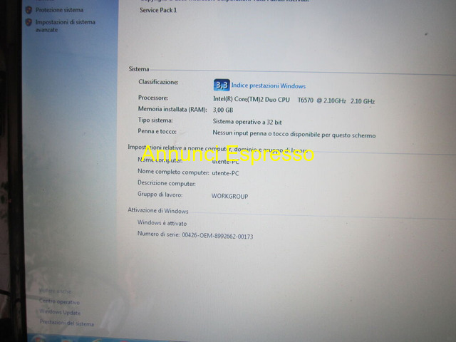 PC-PORTATILE ASUS K70 INTEL1C DISPLAY GRANDE DA 17 ACER prezzo EUR.300,00 UN PC PORTATILE DALLO SCHERMO UNICO ?. PARLIAMO DI ASUS K70IJ-X1 notebook/portatile Nero 43, 9 cm (17. 3") 1600 x 900 Pixel Intel? Pentium? dual-core 4 GB DDR2-SDRAM 320 GB Intel? GMA 4500M Windows 7 Home Premium:Questa descrizione breve del ASUS K70IJ E UN PORTATILE CHE OFFRE MOLTA VISIBILITA? E FUNZIONALITA? . . HA 4 ENTRATE USB + LETTORE SCHEDA SD E CD ?DVD IL PC E IN OTTIME CONDIZIONI ?. GIA RESETTATO ?. E POGRAMMATO CON WINDOWS 7 HOME ?COMPLETO DI ACCESSORI CARICABATTERIA + MAUS + BORASA DA TRASPORTO PC ?. . VENDO TUTTO IN BLOCCO 300 EURO INTRATTABILE PREGO DI EVITARE OFFERTE E PIACERE E PERDI TEMPI VARI?. PER ULTERIORE NOTIZIE DI EVENTUALE SPEDIZIONE O DOMANDE TECNICHE CHIAMATE AL NUMERO San Giuseppe Vesuviano (NA)