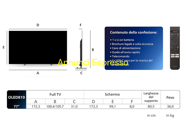 Philips Ambilight 77 pollici OLED 819 4K GoogleTV Philips prezzo EUR.1.750,00 Philips Ambilight 77 pollici OLED modello: 819 4K Smart TV schermo da 77 pollici sottile e privo di cornice, con P5 AI perfect picture ultra HD Google TV Dolby Vision e Dolby Atmos Sound potenza in uscita 70 Watt RMS, funziona con Alexa e Google Assistant, cornice in metallo, TV con luci LED integrate sul retro dello schermo che reagiscono a ciò che guardate lasciandovi immergere in un alone di luce colorata. la TV sembra più grande vi trascina in profondità nella trasmissione preferita. Completo di scatola, telecomando, piedistallo, cavo di alimentazione. NON spedisco in nessun modo l'articolo, ma vendo solo con ritiro da parte dell'interessato sotto la sua completa responsabilità di spostarlo da dove è al momento appeso ed imballarlo nella sua scatola originaria. TV impeccabile utilizzato pochissimo con ancora 24 mesi di garanzia ufficiale Philips Italia, acquistato presso negozio fisico. VENDO. -*- PREZZO * NON * TRATTABILE -*- - NON inviate messaggi solo cel. 393/5716945 Ferrara (FE)