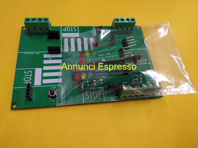 schede interfaccia e modellino semaforo per PLC G-Tronic Robotics kit per esercizi con PLC prezzo EUR.60,00 non trattabili Modellino di un incrocio semaforico di due strade con due attraversamenti pedonali, utile per esercitazioni con tamburi ciclici e uso dell'orologio hardware del sistema. Interfaccia doppio ponte H per collegare due motori DC oppure un motore stepper bipolare. Interfaccia con ponte H a rele e mosfet per il controllo della velocita' generando un segnale PWM. I programmi demo per farli funzionare si trovano sul sito della gtronic, sviluppati per TIA Portal di Siemens. Il prezzo comprende la spedizione. Padova (PD)