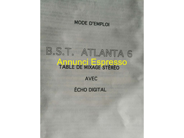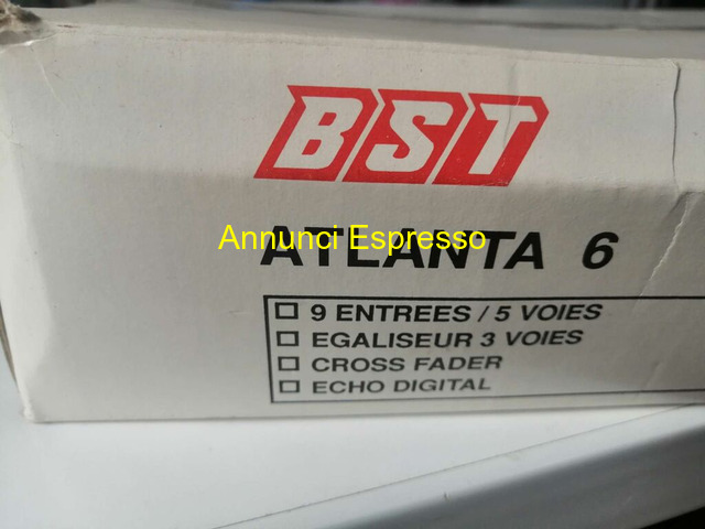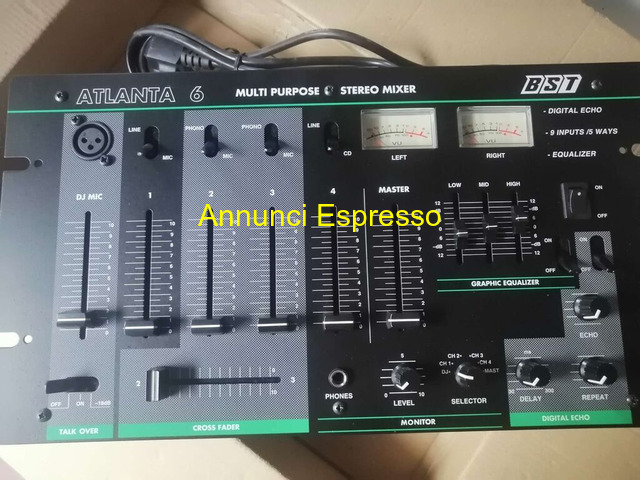 Mixer stereo B.S.T. ATLANTA 6 B.S.T. prezzo EUR.49,00 Mixer B. S. T. ATLANTA 6, stereo, multiuso, con effetto eco digitale. Ottimo stato (nuovo, mai usato), utile per DJ e audio professionisti. Cross fader (permette di mixare due sorgenti sonore in modo graduale) spostando il cursore del cross fader da un canale all'altro. Equalizzatore a 5 vie. 9 entrate. In confezione originale, con manuale ed istruzioni. Orvieto (TR)
