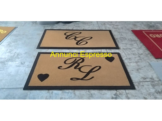 0-ZERBINI PERSONALIZZATI ad intarsio prezzo EUR.50,00 Tappeti personalizzati con iniziali. Materiale resistente, adatti per ingressi e esterni. Design elegante con cuori. Misure variabili. Ideali per decorazione e accoglienza. Disponibili per personalizzazione. Brusciano (NA)
