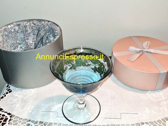 Alzata a coppa vintage Tecnostudio Andria in vetr prezzo EUR.58,00 Alzata a coppa vintage Tecnostudio Andria in vetro decorato a mano con festoni . In custodia regalo cartonata . Dimensioni coppa : altezza cm . 14, 5 diametro cm . 14 Vendo ? 58 . Gradito contattato telefonico . [NUM] Lodi (LO)