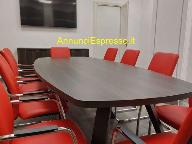 Arredo per sala riunione direzionale nuovo prezzo EUR.1.300,00 Arredamento per sala riunione direzionale nuova imballata composta da : tavolo riunione mis. 280x120x74h forma ellittica mobile basso mis. 180x46x80h ante battenti con serratura , top superiore di finitura possibilita di variare le finiture n. b SEDUTE ESCLUSE astenersi perditempo ed affaristi prezzo al netto dell'iva. per info [NUM] Fulvio Ufficio moderno con tavolo ovale in legno scuro e sedie rosse. Adatto per riunioni e conferenze. Volla (NA)