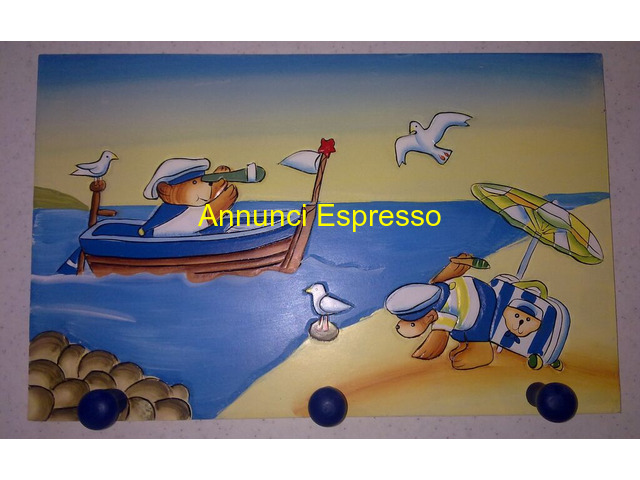 Attaccapanni Quadro da muro a 3 ganci Orsetti prezzo EUR.14,00 Attaccapanni Quadro da muro a 3 ganci Orsetti al mare scolpito e pitturato misure 40 x 25 cm. ritiro su Grosseto o spedizione. Grosseto (GR)
