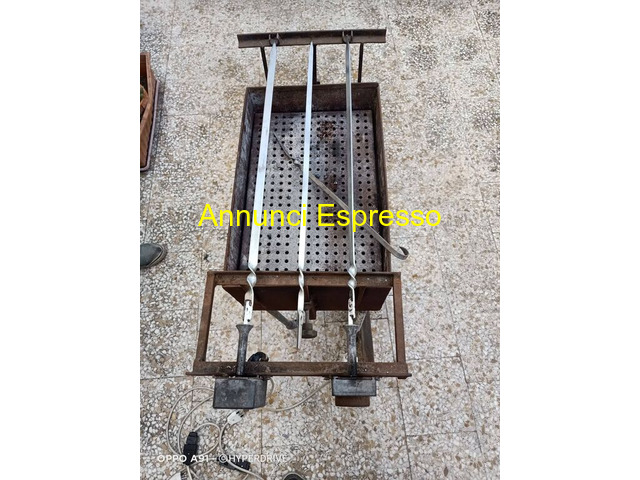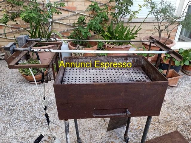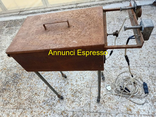 BARBECUE ARTIGIANALE prezzo EUR.90,00 BARBECUE TIPO PESANTE CM. 32X50X H. 21 TOTALE CM. 80 ALTEZZA SPIEDI REGOLABILE 3 SPIEDI ACCIAIO INOX MOTORINI ELETTRICI GIRA ARROSTO CON INTERRUTTORI SINGOLI ALZATE LATERALI PARAVENTO CM. 20 GRIGLIA PORTA CARBONE SMONTABILE PIEDI SMONTABILI CON RUOTE COPERCHIO PER CHIUSURA USATO COME DA FOTO SONO DISPONIBILE PER INF. FOTO POSSIBILE SPEDIZIONE Matera (MT)