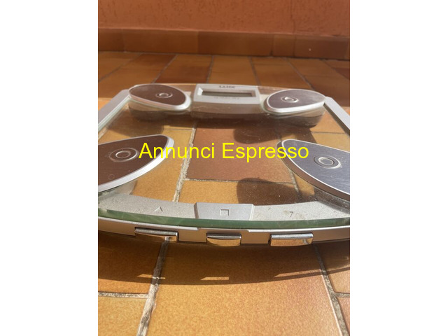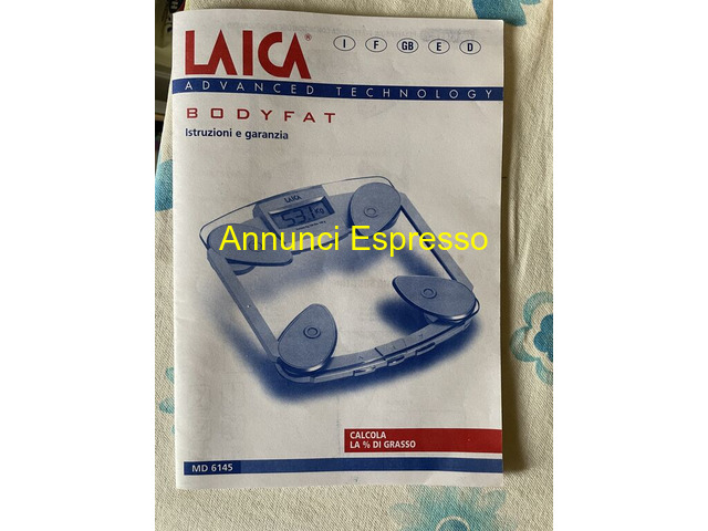 BILANCIA PESAPERSONE LAICA MD6145 prezzo EUR.15,00 BILANCIA PESAPERSONE LAICA MD6145 Pesapersone in vetro e alluminio, calcolo peso corporeo fino a 150 kg. , programmi per calcolo percentuale di grasso corporeo, batterie al litio sostituibili, 4 sensori laterali, display lcd , spegnimento automatico, 4 zone di memoria per inserimento dati personali, dimensioni 33x31x4, 4 cm. Libretto istruzioni incluso. A Desio MB . solo con ritiro , no spedizioni. 15 euro Bilancia digitale marca LAICA, con display LCD. Struttura in vetro temperato, design moderno. Utile per monitorare il peso corporeo. Adatta per uso domestico. In buone condizioni. Desio (MB)