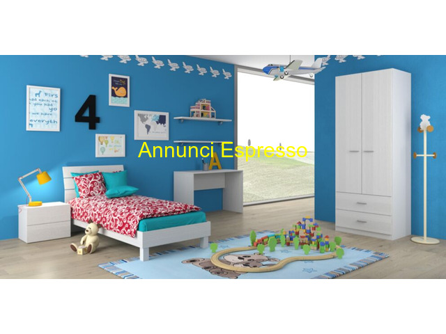 CAMERETTA prezzo EUR.1.120,00 CAMERETTA 27 MODELLO PIX, ARMADIO 2 ANTE + 2 CASSETTI , SCRIVANIA DA CM 110, COMODINO A 2 CASSETTI, LETTO DA 80 , 2 MENSOLE . MATERASSO DA 80X190 A MOLLE INSACCHETTATE INDIPENDENTI ALTEZZA CM 23 , RETE DA 80 X 190 IN FERRO VERNICIATO NERO E DOGHE IN MULTISTRATO DI FAGGIO. Brugnera (PN)