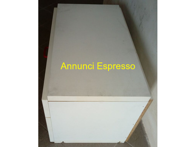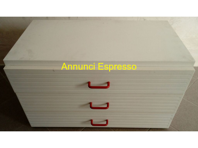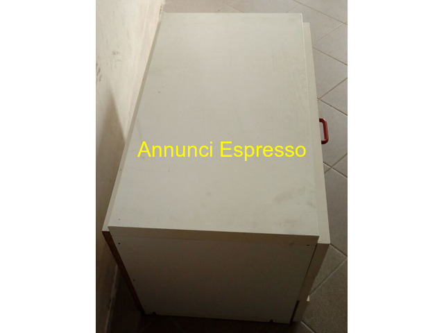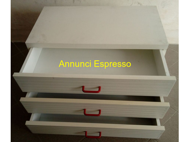 Cassettiera completa misure 60 x 35 x H 35 cm. prezzo EUR.35,00 Cassettiera completa misure 60 x 35 x H 35 cm. colore bianco perfettamente funzionante da interno armadio e da esterno ritiro su Grosseto o spedizione. Mobiletto bianco con tre cassetti, maniglie rosse, adatto per riporre oggetti e materiali vari. In buone condizioni. Grosseto (GR)