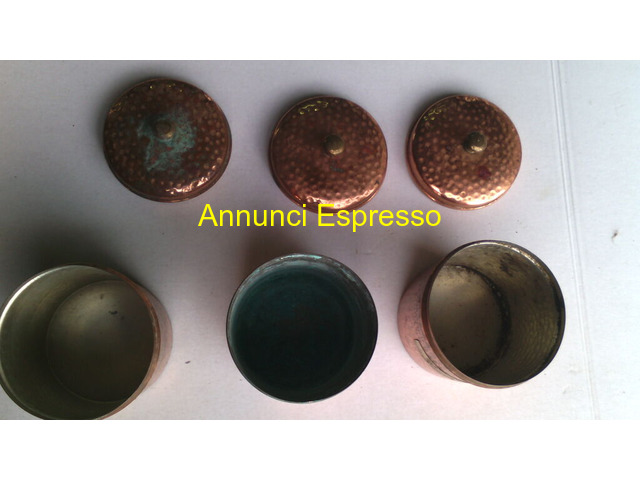 Contenitori SALE, CAFFE, ZUCCHERO Vintage, in Rame prezzo EUR.45,00 Contenitori SALE, CAFFE, ZUCCHERO Vintage, in Rame con targhetta e pomello in ottone. All'interno ? rivestito in Stagno. a chi piace si possono pulire da ossido, Altezza 13 cm, diametro 10 cm. Ritiro su Grosseto o spedizione Grosseto (GR)