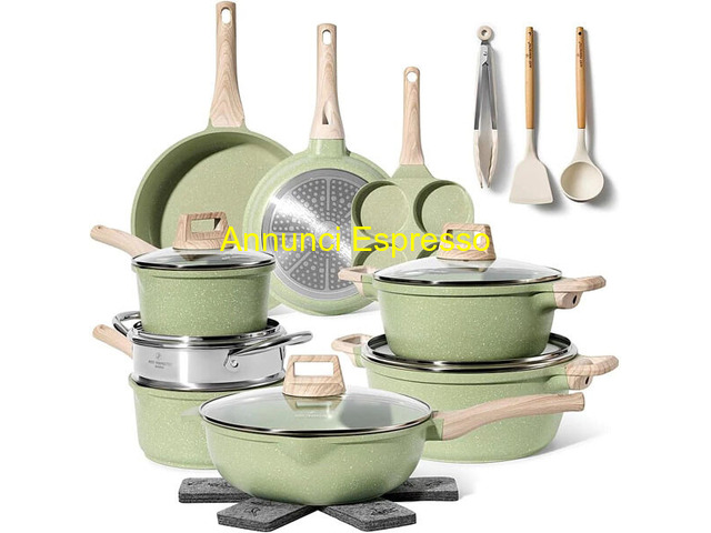 Just Perfecto JL-723: Set di 21 utensili prezzo EUR.90,00 Set di pentole e utensili da cucina in verde. Comprende padelle, casseruole, falde vapore, scolapasta e spatole. Materiale antiaderente, manici ergonomici. Ideale per la cucina moderna. Adatto per vari metodi di cottura. Ottimo per chi ama cucinare. Vittorio Veneto (TV)