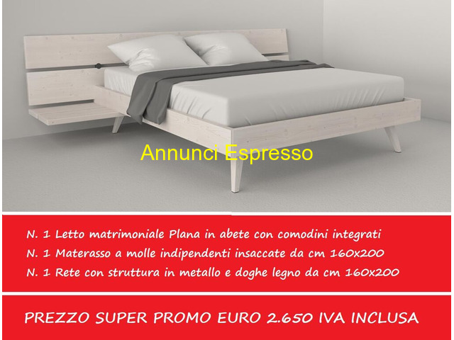 letto matrimoniale plana in abete con comodini prezzo EUR.2.650,00 N . 1 Letto matrimoniale in abete massello, verniciatura base acqua, colore a scelta in prima fascia spazzolata, inclusi abbiamo anche la relativa rete con struttura metallo e doghe legno, e materasso con molle indipendenti insaccate da cm 160x200 PREZZO PROMO EURO 2. 650 IVA INCLUSA Trento (TN)