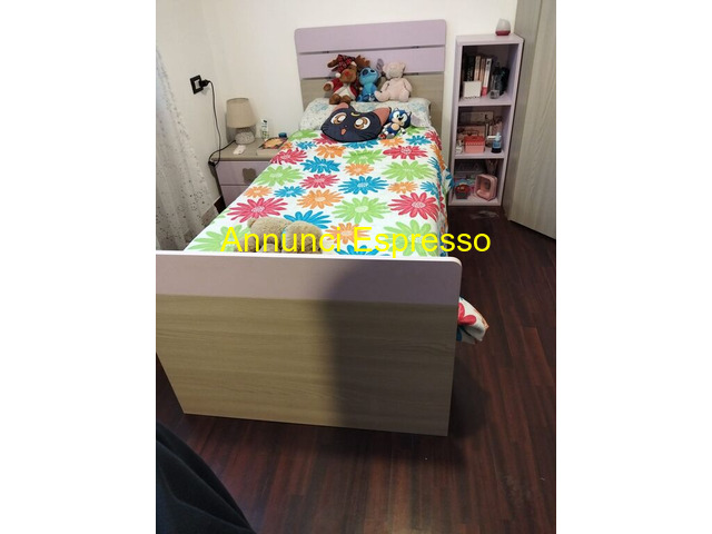 Letto singolo+comodino+mensola prezzo EUR.150,00 Vendo per cambio cameretta letto singolo 89x198x100 cm colore olmo perla e lilla come da foto compreso di rete a doghe e materasso memory 80x190x20. Nel prezzo è compreso anche il comodino con maniglia a forma di quadrifoglio 48x40x36 e mensola che si può anche appendere al muro 92x32x32 abbinati a 150 euro. Il tutto è in ottime condizioni, solo il materasso è un pochino macchiato ma si può lavare facilmente ed è ancora molto comodo. Letto singolo con testiera in legno, copriletto colorato e peluches. Adatto per camera bambini. Buone condizioni. Bernareggio (MB)