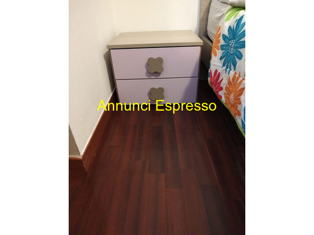 Letto singolo+comodino+mensola prezzo EUR.150,00 Vendo per cambio cameretta letto singolo 89x198x100 cm colore olmo perla e lilla come da foto compreso di rete a doghe e materasso memory 80x190x20. Nel prezzo è compreso anche il comodino con maniglia a forma di quadrifoglio 48x40x36 e mensola che si può anche appendere al muro 92x32x32 abbinati a 150 euro. Il tutto è in ottime condizioni, solo il materasso è un pochino macchiato ma si può lavare facilmente ed è ancora molto comodo. Letto singolo con testiera in legno, copriletto colorato e peluches. Adatto per camera bambini. Buone condizioni. Bernareggio (MB)