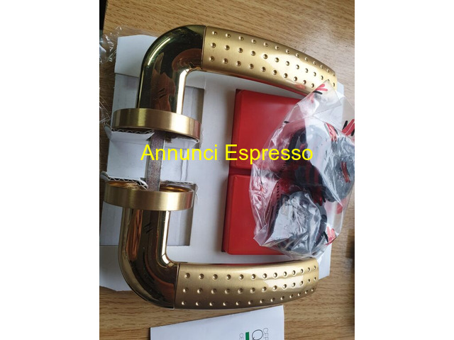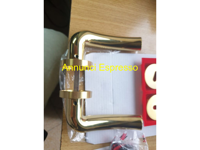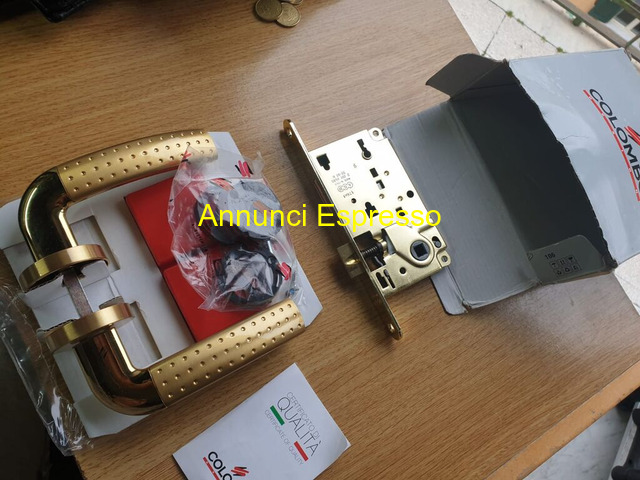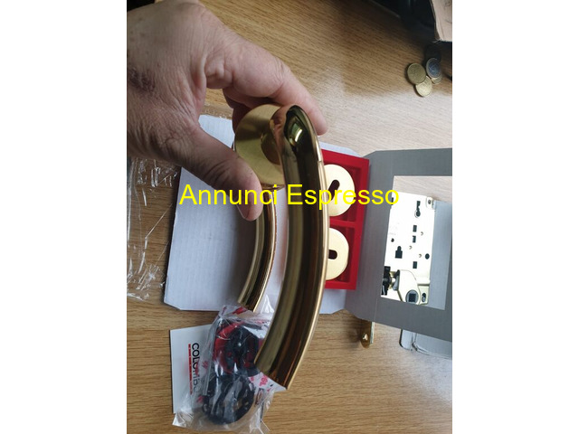 MANIGLIE X PORTE INTERNE MARCA COLOMBO-MOD-MILLY-5 prezzo EUR.260,00 CAUSA MANCATO REALIZZO RISTRUTTURAZIONE CASA 8 ( tel [NUM] ) . . . . VENDO 5 COPPIE DI MANIGLIE DI MARCA COLOMBO-DESIGN MODELLO MILLY CON RIFINITURE CROMO ORO PER PORTE DA INTERNO COMPLETE DI SERRATURE AD INCASTRO AGB COMPLETA DI CHIAVE CON RIFINITURA -CROMO ORO TUTTO IL MATERIALE E NUOVO IMBALLATO CON RELATIVO DI CERTIFICATO DI GARANZIA HANNO AVUTO UN PREZZO DI ACQUISTO DI EURO 500 . . . . . VENDO SOLO IN BLOCCO AD EURO 260 INTRATTABILE POSSIBILE SPEDIZIONE TRAMITE CORRIERE ASSICURATO INCLUSA NEL PREZZO -PAGAMENTO -BONIFICO -PAY PAL-CONSEGNA A MANO PER EVENTUALE RICHIESTE TECNICHE O ULTERIORE FOTO RISPONDO SOLO A CONTATTO TEL. [NUM] Maniglione in metallo dorato, design moderno, con inclusi accessori in plastica. Adatto per porta o finestra. Nuovo, imballato. Ideale per ristrutturazioni o nuove installazioni. San Felice a Cancello (CE)