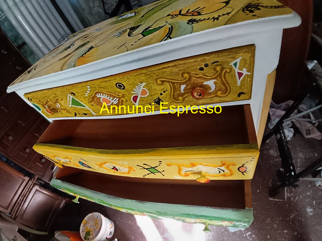 MOBILE CASSETTIERA DIPINTA A MANO FIRMATA prezzo EUR.300,00 GENOVA. VENDO CASSETTIERA SETTIMINO IN LEGNO MASSICCIO GRANDE, TUTTA DIPINTA A MANO CON TECNICA MISTA ACRILICI E SMALTI 'SPRING KANDY' OMAGGIO A PITTORE FAMOSO FIRMATA. CONSEGNO SOLO A MANO A CHI LA VIENE A RITIRARE A GENOVA SAN MARTINO CON UN SUO MEZZO IDONEO. ESSENDO DIPINTA A MANO VA TRASPORTATA CON MAGGIORE ATTENZIONE PERCHE' PIÙ DELICATA DI UN MOBILE INDUSTRIALE. MISURE CM H. 133XL. 87XP. 48 Genova (GE)