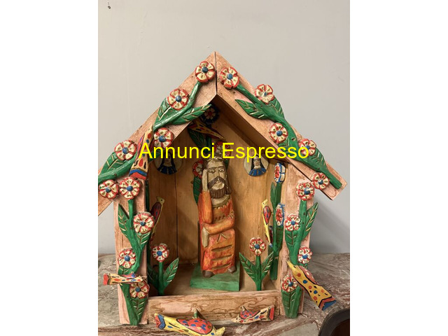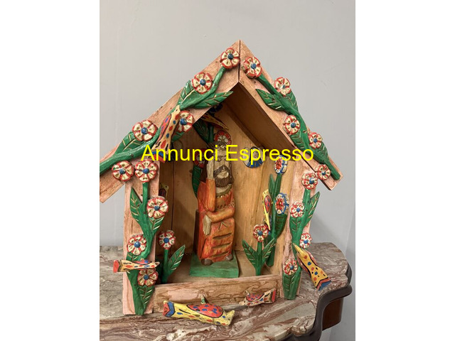 Opera contemporanea in legno dipinta, Capanna prezzo EUR.220,00 Opera contemporanea in legno dipinta, Capanna con Gesù, 56x57x30cm. Artista del nord Europa, scultura a rilievo, stato molto buono. Viterbo (VT)