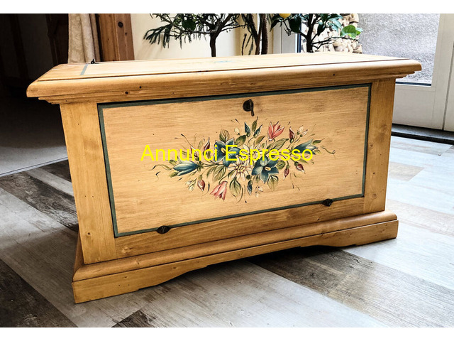 panchetta abete decorata a mano prezzo EUR.750,00 Particolare cassapanca in abete con decorazione realizzate a mano floreali, con sistema a ribalta, in foto finitura "Miele-Panna invecchiato", lunghezza 80, altezza 45 cm e profondità 40 cm. Trento (TN)