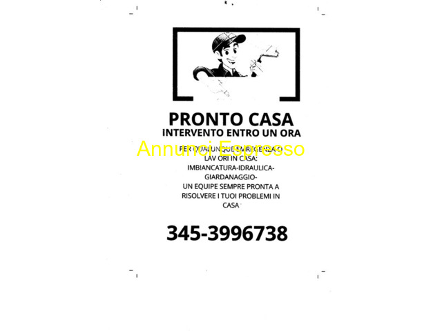 PRONTO INTERVENTO E LAVORI IN CASA prezzo EUR.12,00 Servizio di pronto intervento per lavori in casa, incluso riparazioni e manutenzione. Interventi rapidi entro un'ora. Contatto telefonico [NUM]. Adatto a problemi domestici di ogni tipo. Disponibilità entro un'ora. Esperti qualificati per risolvere problemi in casa. lavori eseguibili: giardinaggio-imbiancatura-porte e serrature- impianto elettrico sede a TRAPANI ( PER INTERVENTI NEL COMUNE DI TRAPANI. . nessun diritto di chiamata, . . per la provincia . . DIRITTO DI CHIAMATA ? 50, 00) Contatto telefonico [NUM]. . Assistenza disponibile entro un'ora. Valderice (TP)