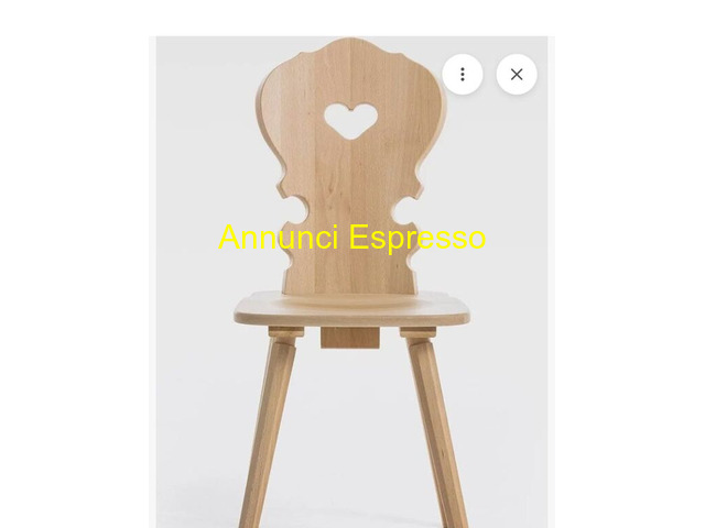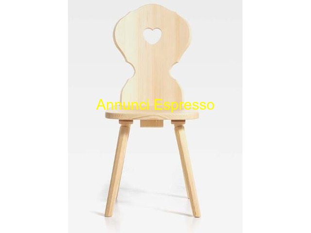 Sedie tirolesi finitura grezzo prezzo EUR.80,00 Sedia in legno chiaro finitura grezzo con schienale a forma di cuore. Design elegante e moderno adatto per interni. Ottima per bambini o ambienti casual. Condizioni nuove. Minimo ordine 4 sedie compatte. Ideale per arredare stanze da gioco o soggiorni. Belluno (BL)
